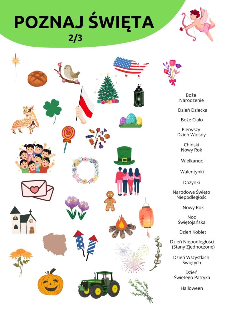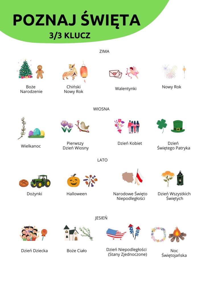 Prowadzący tłumaczy zasady – dzieci będą patrzyły na obrazek na kartce. Starają się zgadnąć, o jakie święto chodzi. Następnie szukają drugiego obrazka, który przedstawia to samo wydarzenie. Po odgadnięciu każdej ilustracji omawiają wspólnie, co jest charakterystyczne dla tego święta i kiedy jest obchodzone. Swoją odpowiedź powinny przyporządkować do konkretnej pory roku na tablicy edukacyjnej.